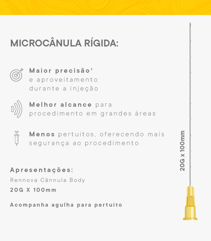 A Cânula Rennova Body 20G 100mm é uma cânula de uso único, estéril e com ponta romba, desenvolvida especialmente para aplicações corporais profundas e seguras. Seu calibre 20G oferece equilíbrio entre rigidez e flexibilidade, enquanto os 100mm de comprimento proporcionam amplo alcance com menos pontos de entrada, o que contribui para uma aplicação mais uniforme e confortável ao paciente.
