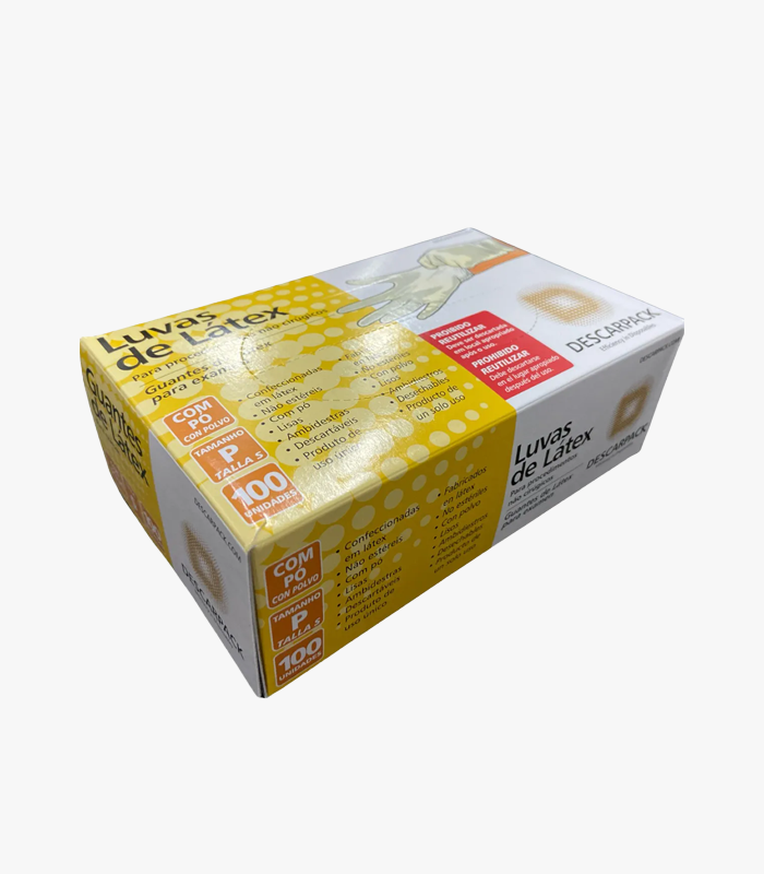 Luva de Procedimento Descarpack tamanho P com pó para barreira de proteção em procedimentos não cirúrgicos. Caixa com 100 unidades. Uso único, troque entre atendimentos e descarte após o uso. Suspender em caso de irritação ou alergia.